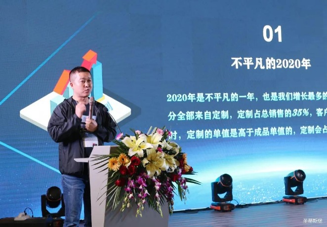 华灯璀璨的开场仪式,点燃了现场如火如荼的气氛。今年会jnh集团集团营销总经理陈玉伟先生对晚会进行了主题发言,他对2020年的营销工作进行了总结,并着重从营销工作部署、重点项目开展、产品整合、拎包帮扶、渠道运营和移动+定制整装优势等方面对2021年的营销工作做了全面的统筹规划。同时,他还讲解了“美国梦凯莎床垫”新品的产品工艺、市场优势、产品定位,使经销商对我们的新产品拥有更深入的认识和了解。